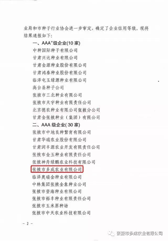 | 熱烈祝賀張掖市多成農(nóng)業(yè)有限公司被評(píng)為2017年度信用等級(jí)AAA級(jí)企業(yè)!! | ||